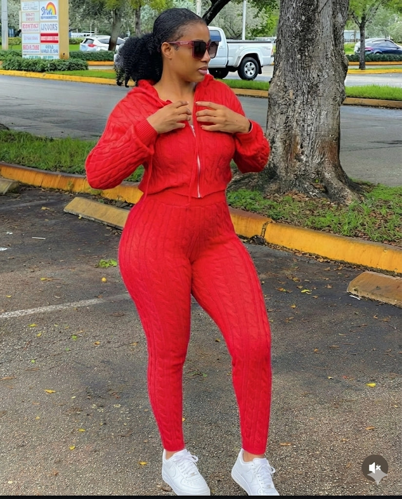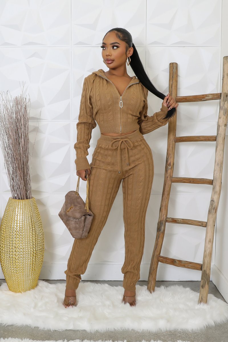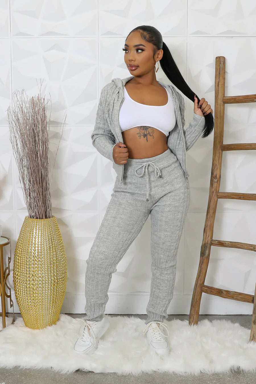 Two piece knit set featuring a zip front hoodie and matching fitted pants.